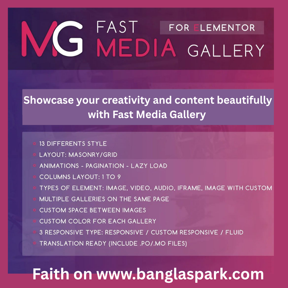 Fast Media Gallery is a powerful and lightweight WordPress plugin designed specifically for Elementor users who want to display images and videos in a clean, responsive, and fast-loading gallery format. Whether you’re a photographer, designer, blogger, or business owner, this plugin helps you showcase your media content with style and performance in mind.