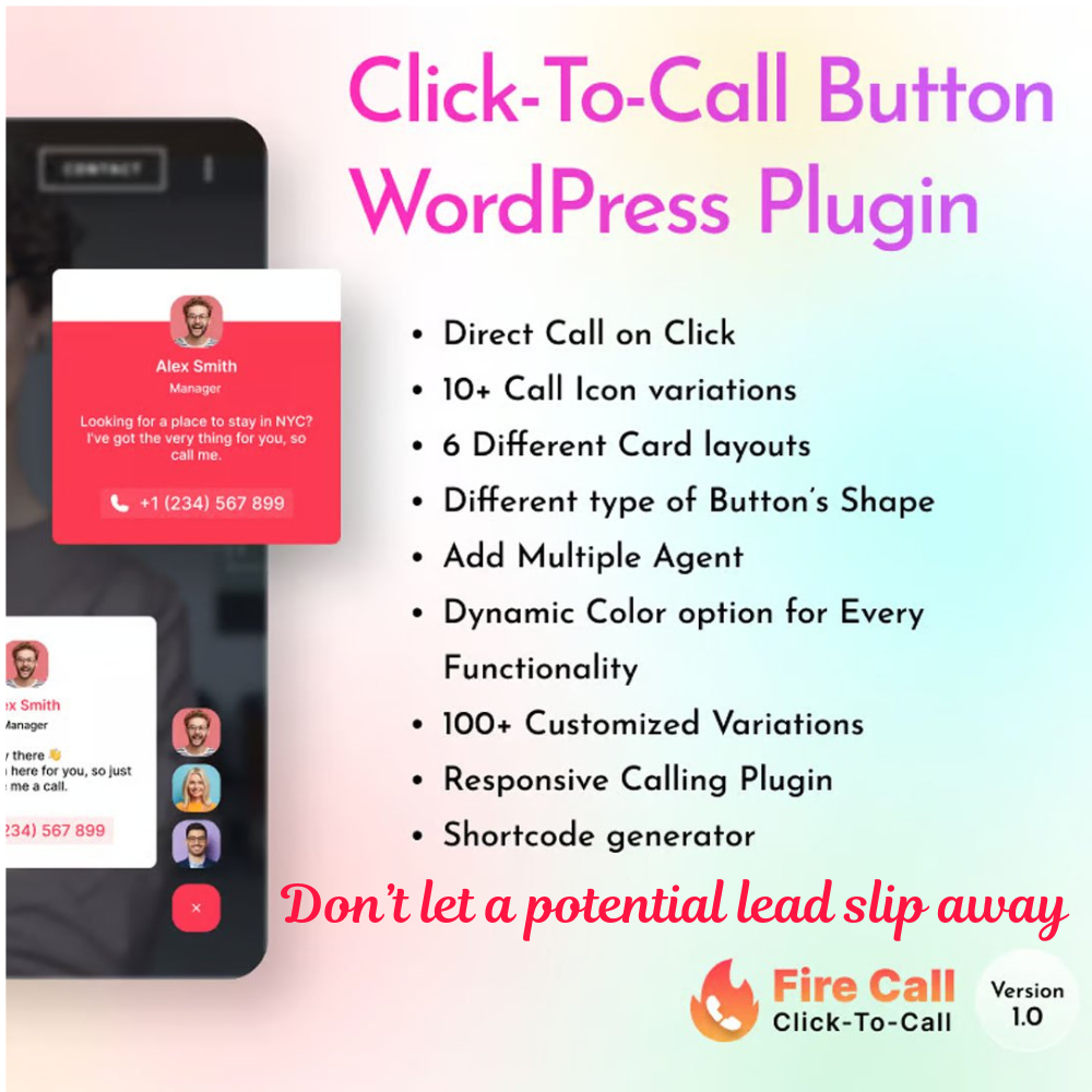 Convert website visitors into real-time phone leads with Fire Call, the ultimate click-to-call button plugin for WordPress. Designed to increase user interaction and boost conversions, this lightweight plugin adds a customizable call button that lets mobile users contact you instantly—no dialing required.